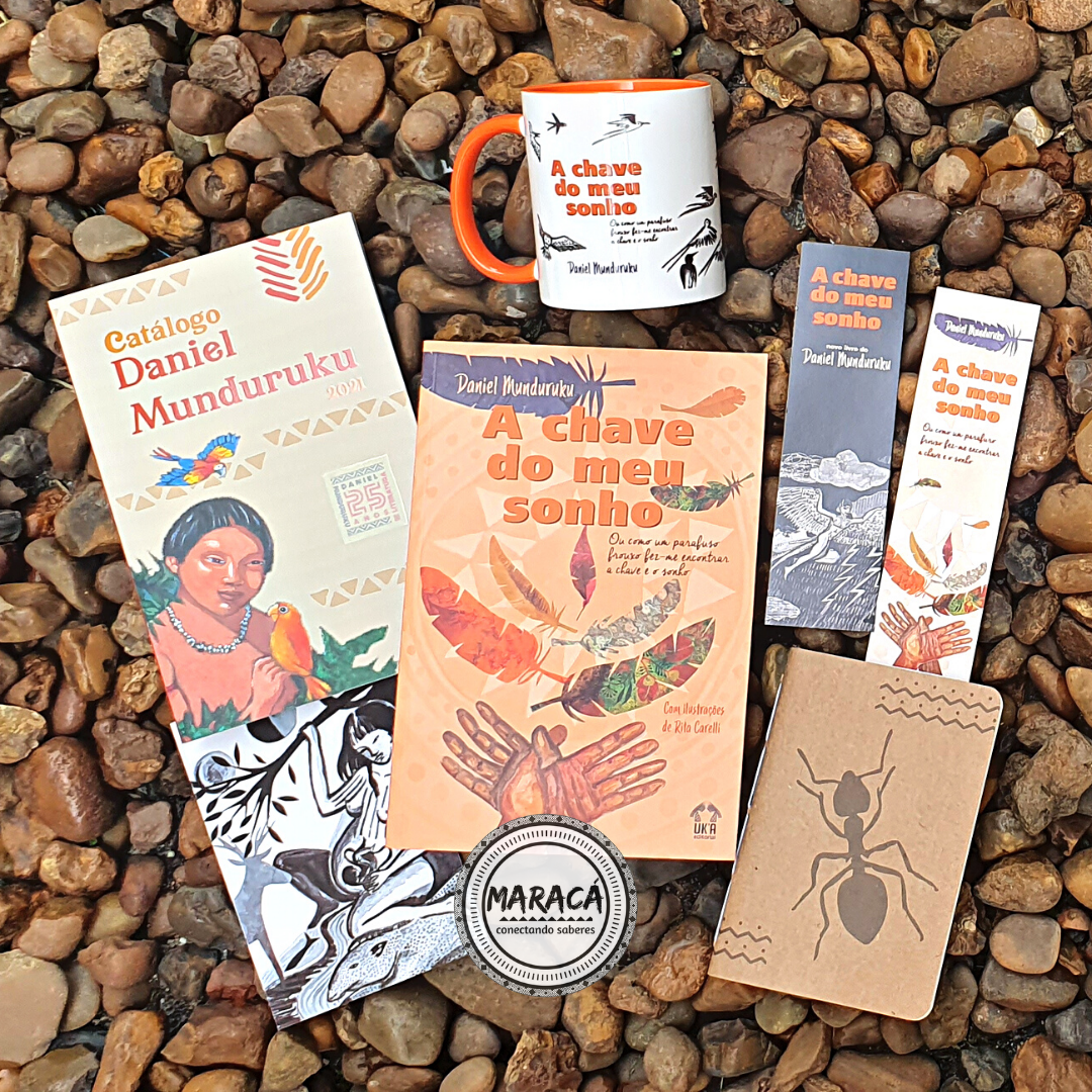 1 exemplar impresso do livro A chave do meu sonho, de Daniel Munduruku + marcadores de página + Card (postal) com ilustração de Rita Carelli + lápis semente + pôster + frete nacional + participação na roda de conversa do Clube de Leitura Marupiara + caderneta artesanal + caneca exclusiva.